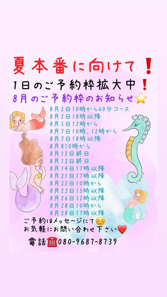8月は夏本番!1日の予約枠を最大限に拡大して対応しております☺️