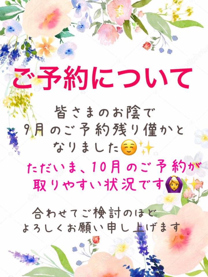 おかげさまで、9月のご予約枠も残りわずかとなっております。