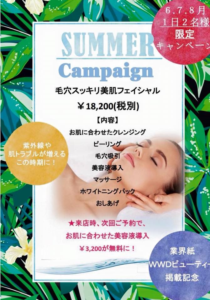 夏の肌トラブルに対応した、集中ケアと美白ケアをセットにしたスペシャルメニューのキャンペーンを行っております。