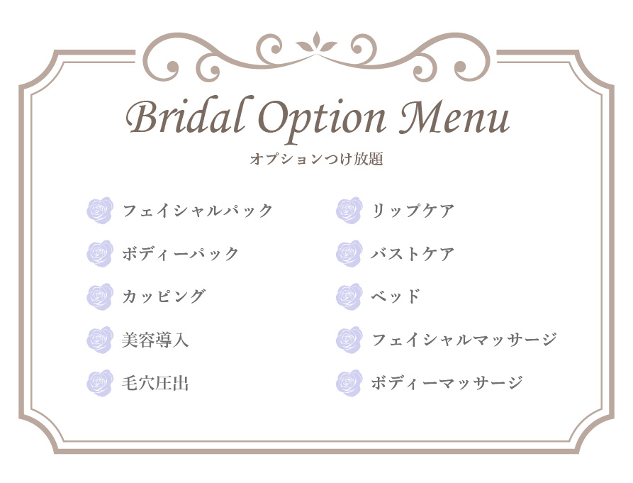 ¥110,000(税込) 150分2回+60分1回コースに、フェイシャルボディー、オプション付け放題のプランになります。