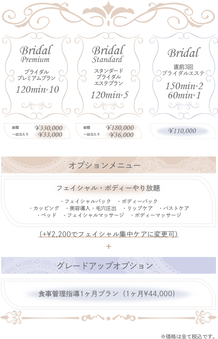 120分コース10回コースに、フェイシャルボディー、オプション付け放題で一回あたり¥33,000(税込)のプランになります。
