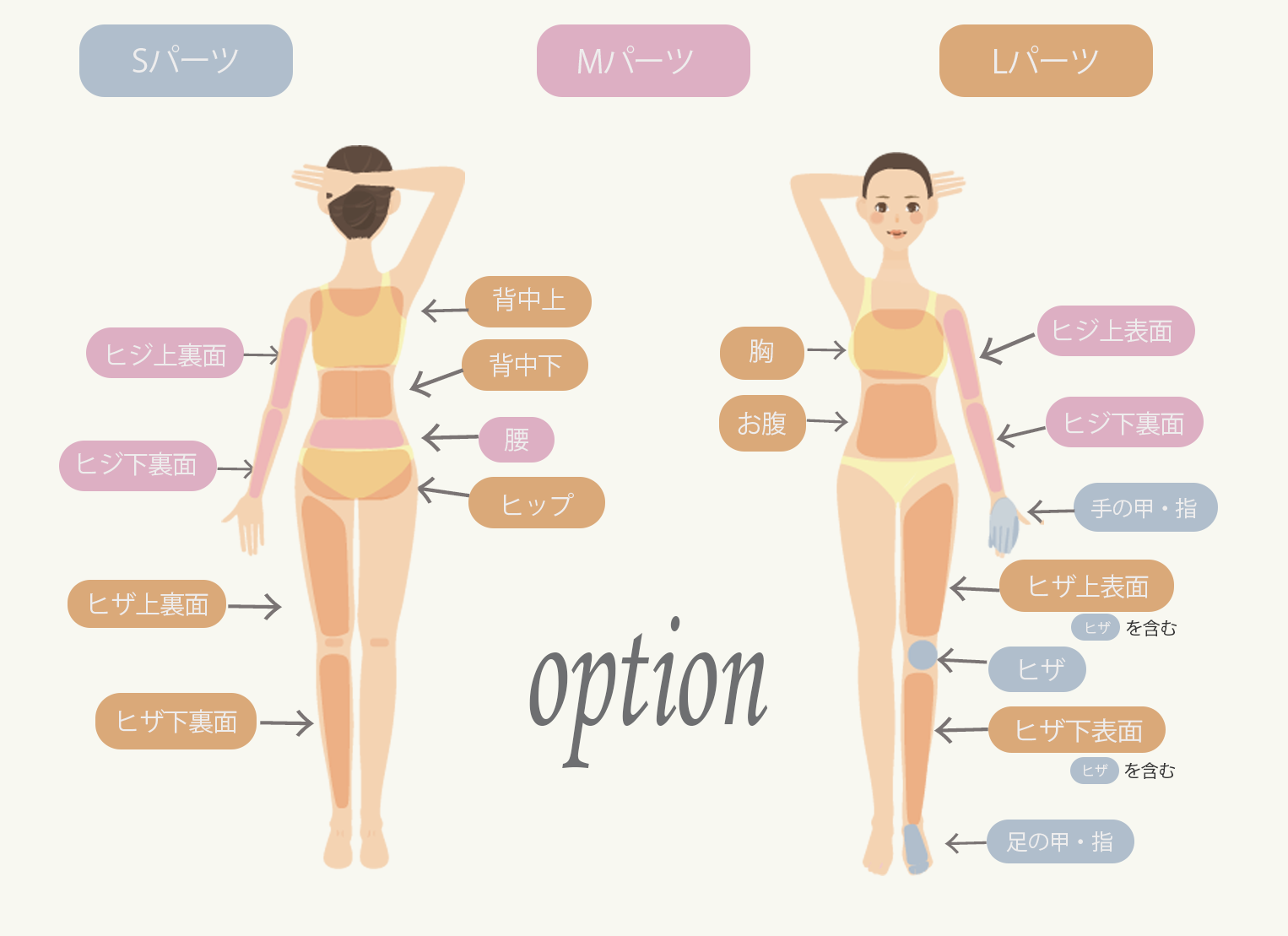 150分2回+60分1回コースに、フェイシャルボディー、オプション付け放題のプランになります。