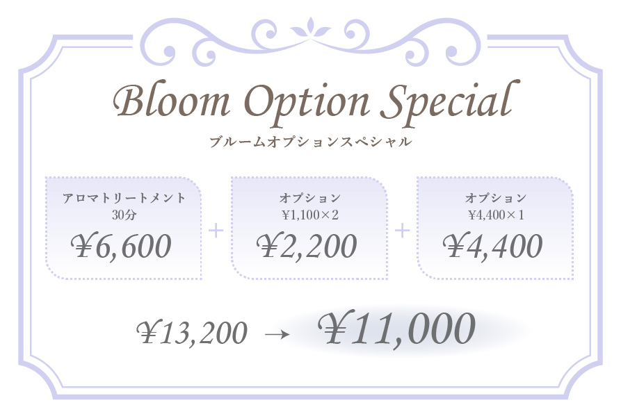 120分コース10回コースに、フェイシャルボディー、オプション付け放題で一回あたり¥33,000(税込)のプランになります。